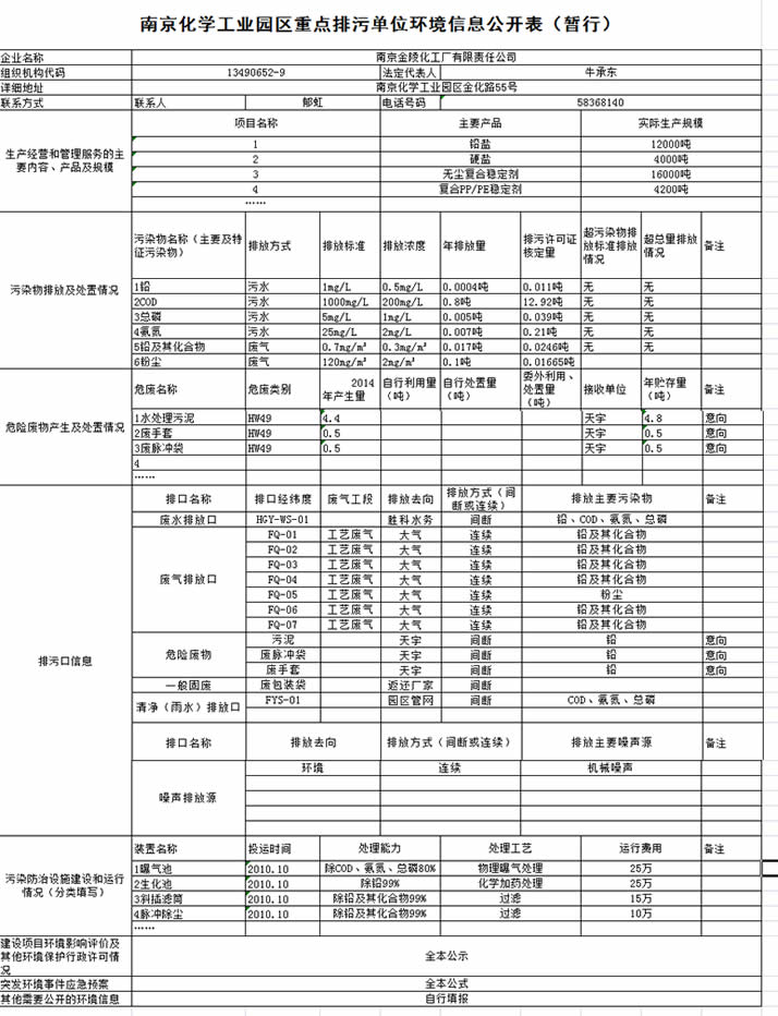 南京化學(xué)工業(yè)園區(qū)重點(diǎn)排污單位環(huán)境信息公開表(暫行)